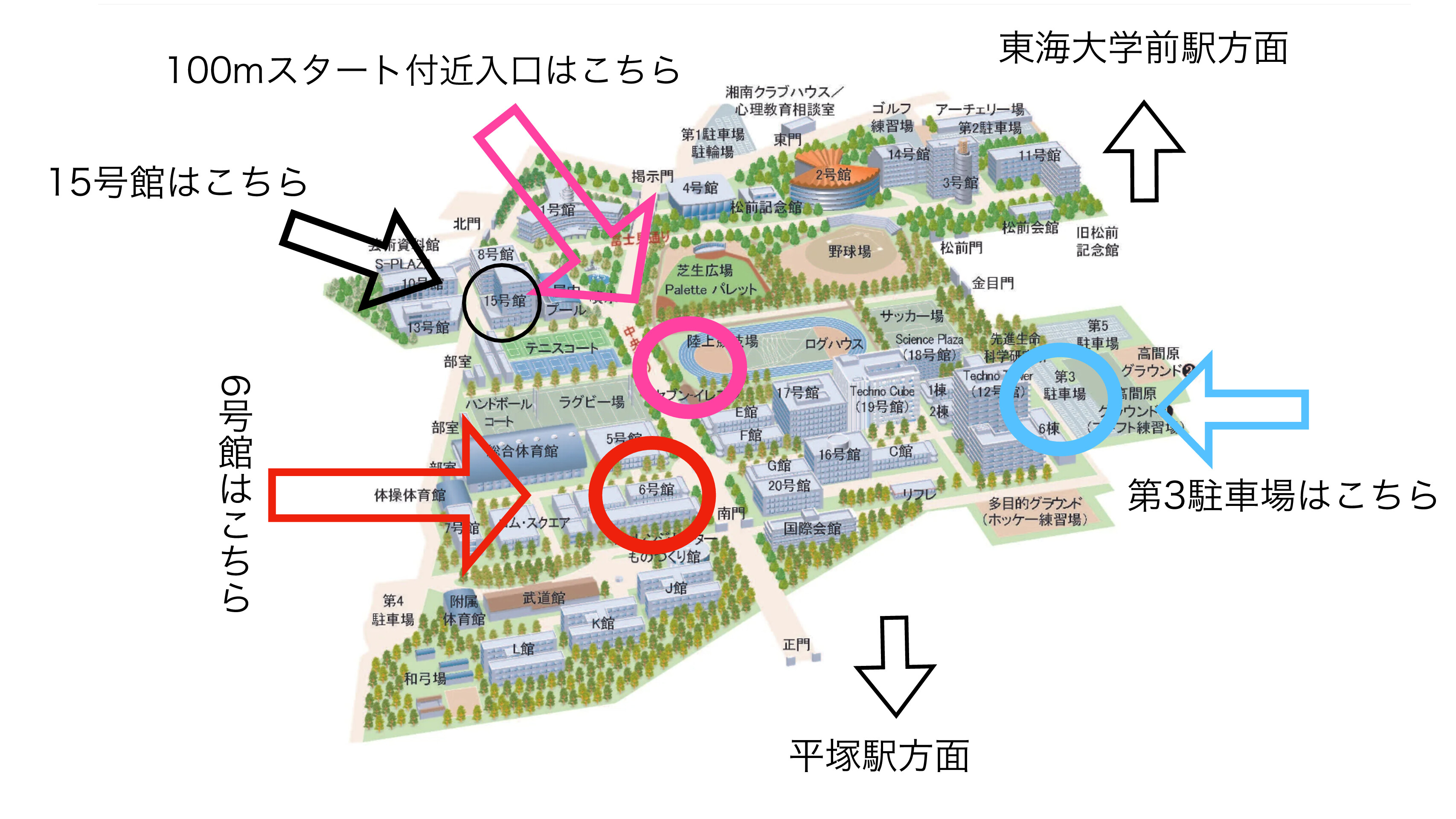 下記の地図をご確認いただきお越しください。 15号館入口にスタッフが立っています。